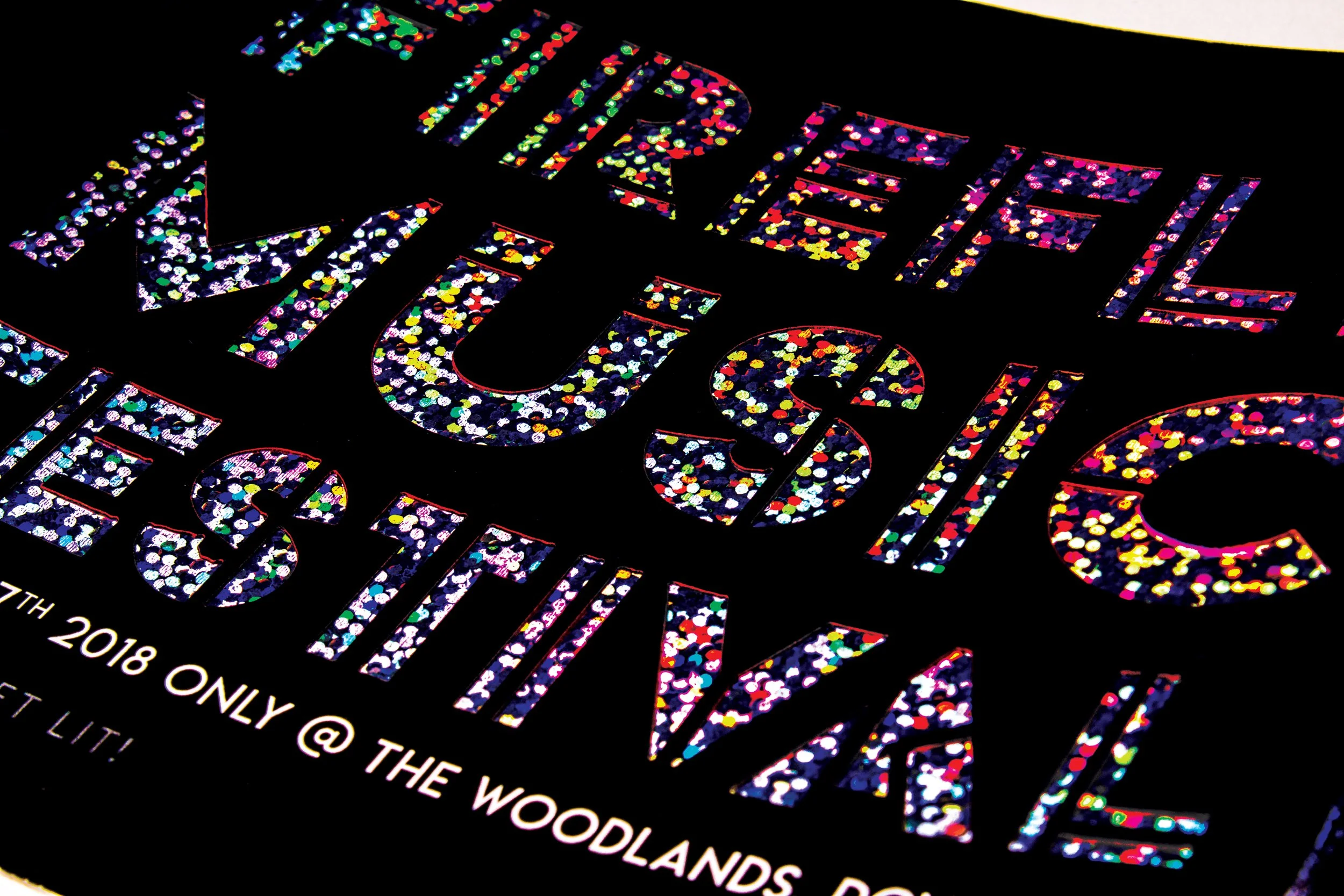 This design was heavily inspired the name of the event — fireflies light up at night, hence the LED lights and the stark contrast of light and dark — but it was also inspired by the event’s atmosphere and experience in which at night there is a light show with bright and colorful strobe lights pierce through the woods. The pops of color against the black highlight a key trait of this fun event.