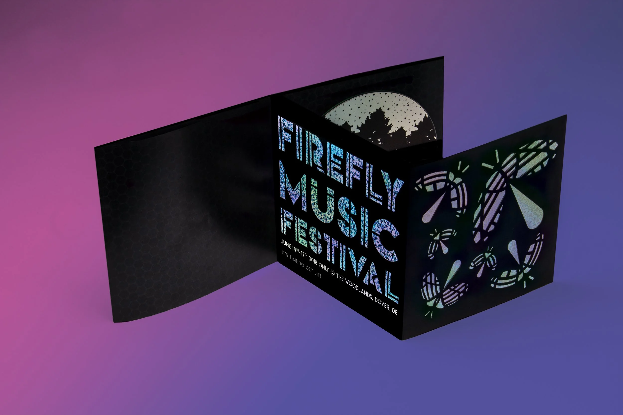 For my event I chose Firefly Music Festival, a three day event held in the woods of Delaware. (Side note — this was designed in 2018 and the bands that year were AMAZING). My mailer, a paper album case, would be sent out to everyone who pre-ordered a ticket. Inside is a CD that has each band’s #1 song on it. The middle folds out to show laser cut fireflies and the band lineup schedule on the back.