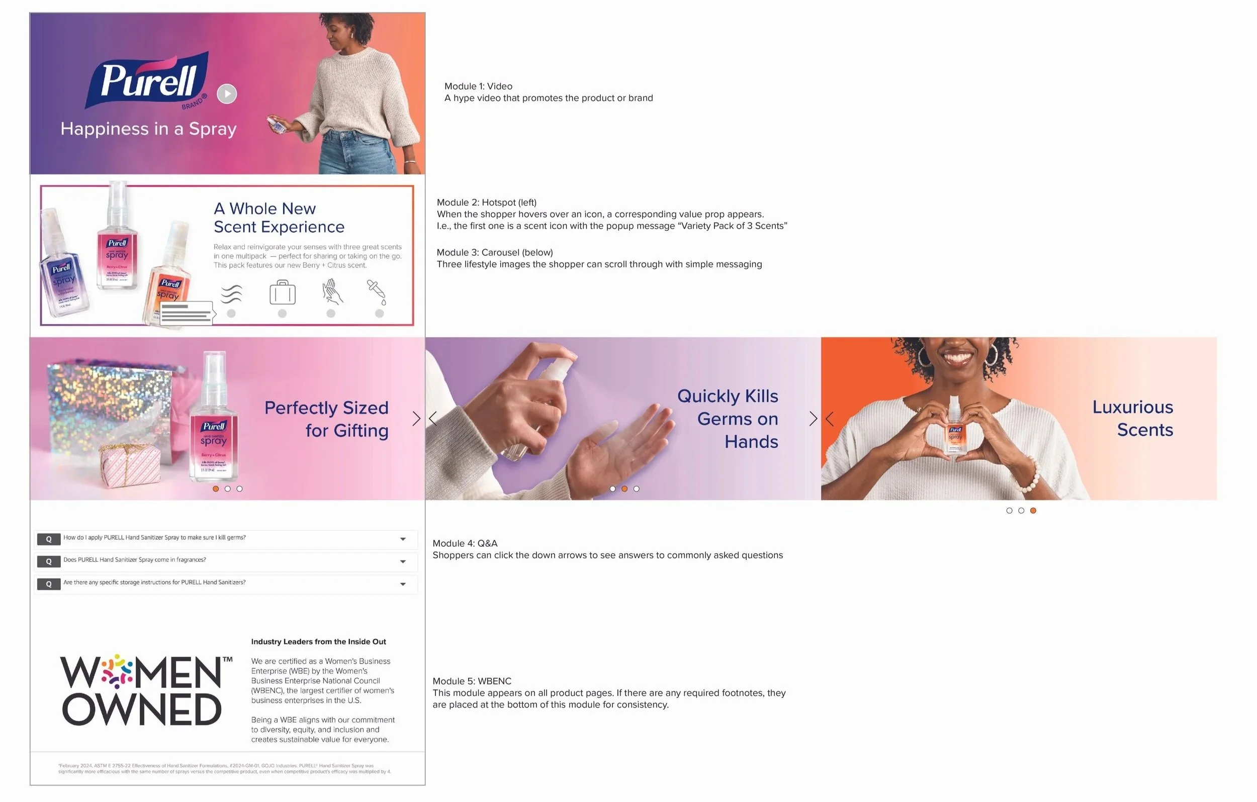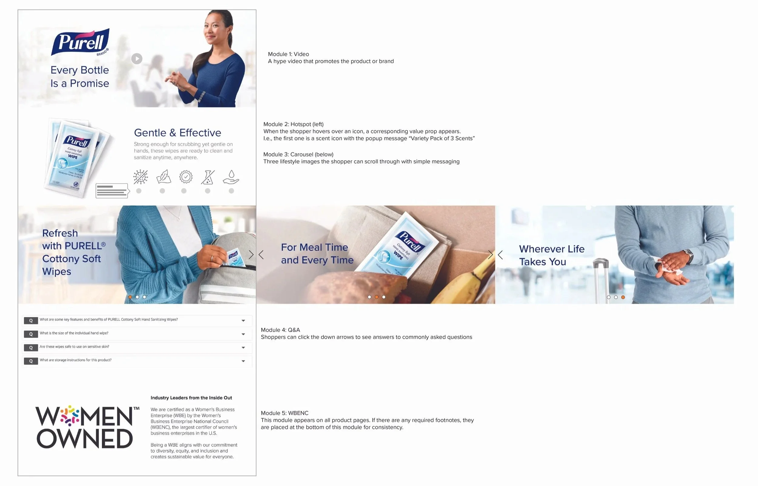 The greatest opportunity lay in the basic content icons—the first visual touchpoint for shoppers across both mobile and desktop. Previously, a limited set of generic images was reused across dozens of SKUs with little product differentiation. I led the effort to design a modern, scalable icon system that was visually distinctive, product-specific (e.g., travel size, formula variations), and unmistakably on-brand for PURELL. This system was extended seamlessly into the enhanced content experience, ensuring a cohesive, end-to-end visual narrative across the entire product page.